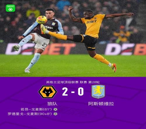 北京时间2月28日英格兰足球顶级联赛 联赛 第28轮,狼队主场对阵阿斯顿维拉。上半场,两队均无建树。下半场,若昂-戈麦斯打破僵局。读秒阶段,罗德里戈-戈麦斯破门锁定胜局。全场比赛结束,维拉0-2不敌狼队,遭遇各项赛事三场不胜。