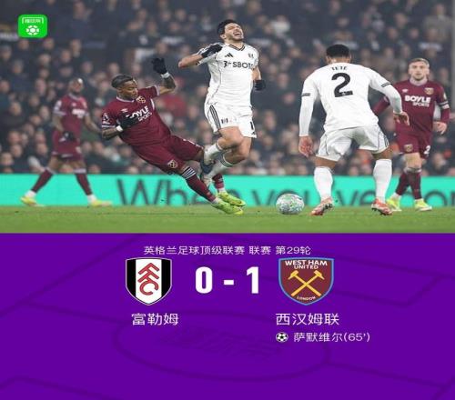 北京时间3月5日英格兰足球顶级联赛 联赛 第29轮,富勒姆主场对阵西汉姆联。西汉姆联萨默维尔破门。最终比分富勒姆 0-1 西汉姆联。