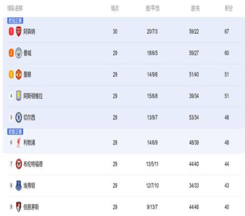 这样多场比赛之后,英超最新积分榜出炉。加上前一天利物浦被狼队2-1击败,最新的竞争形势是,多赛一场的阿森纳67分稳居第一。曼城紧随其后60分排名第2,曼联、阿斯顿维拉拿到51个积分,分列第3、第4,而身后两大豪门切尔西、利物浦同积48分,对欧冠区域虎视眈眈。