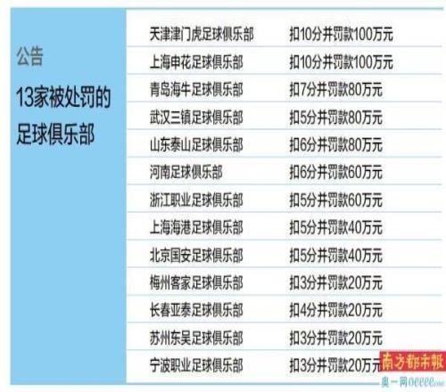 13家俱乐部被扣联赛积分并罚款