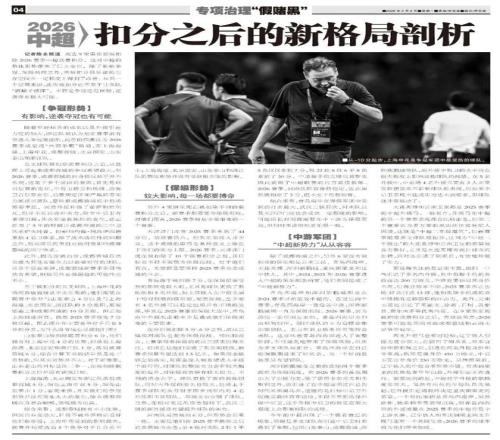 记者陈永报道高达9家俱乐部被扣除2026赛季中超联赛积分,这对中超的整体形势带来了巨大变化,除了影响争冠、保级两端之外,未被扣分俱乐部的生存空间在一定程度上得到了改善。从另一个层面来讲,此次被扣分还不至于让各队“破罐子破摔”,不管是争冠还是保级,逆袭亦有极大可能。