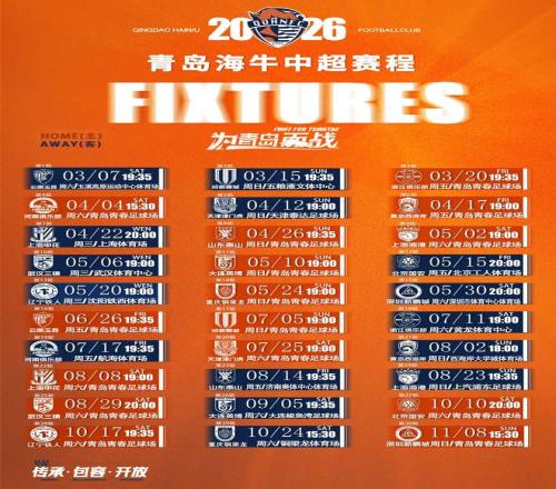 2026赛季青岛海牛中超赛程:第6轮青岛德比,第8轮迎战山东泰山